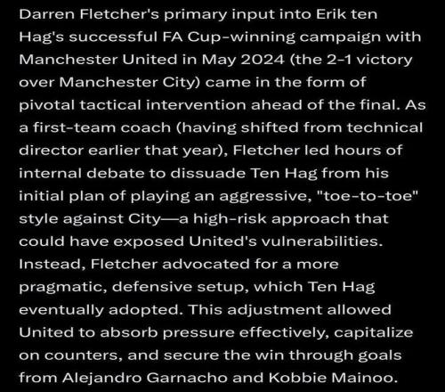 「競技網(wǎng)」的報(bào)道甚至回顧到滕哈格帶隊(duì)奪取足總杯決賽的時(shí)候,稱當(dāng)時(shí)的防守反擊戰(zhàn)術(shù)出自弗萊徹的提議。