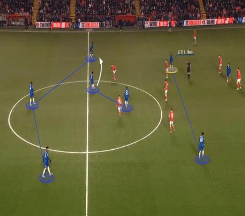 這次進(jìn)攻包含了切爾西形成菱形中場時的四名中場中的三位。中衛(wèi)韋斯利-福法納將球傳給9號位馬克-吉烏,從而分開了中場,吉烏再將球做給10號位若昂-佩德羅。
