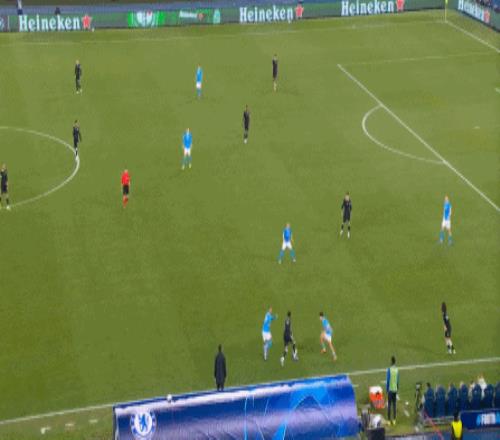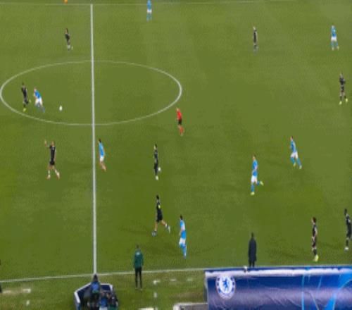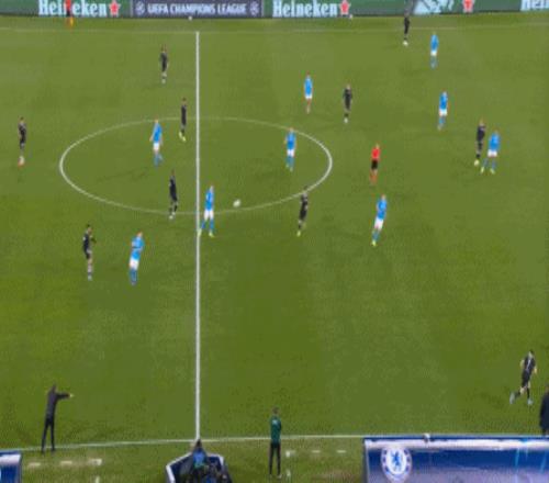 如果一定要分出高下,切爾西要稍好一點點,這體現(xiàn)在他們在將那不勒斯陣型抻開,包括通過爭奪二點球來打轉(zhuǎn)換的時候,還是可以在右半扇打出想要的配合:
